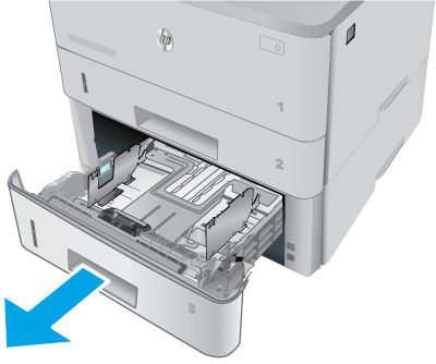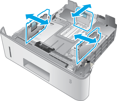 Adjust the paper guides by squeezing the adjustment latches and sliding the guides to the size of the paper being used.